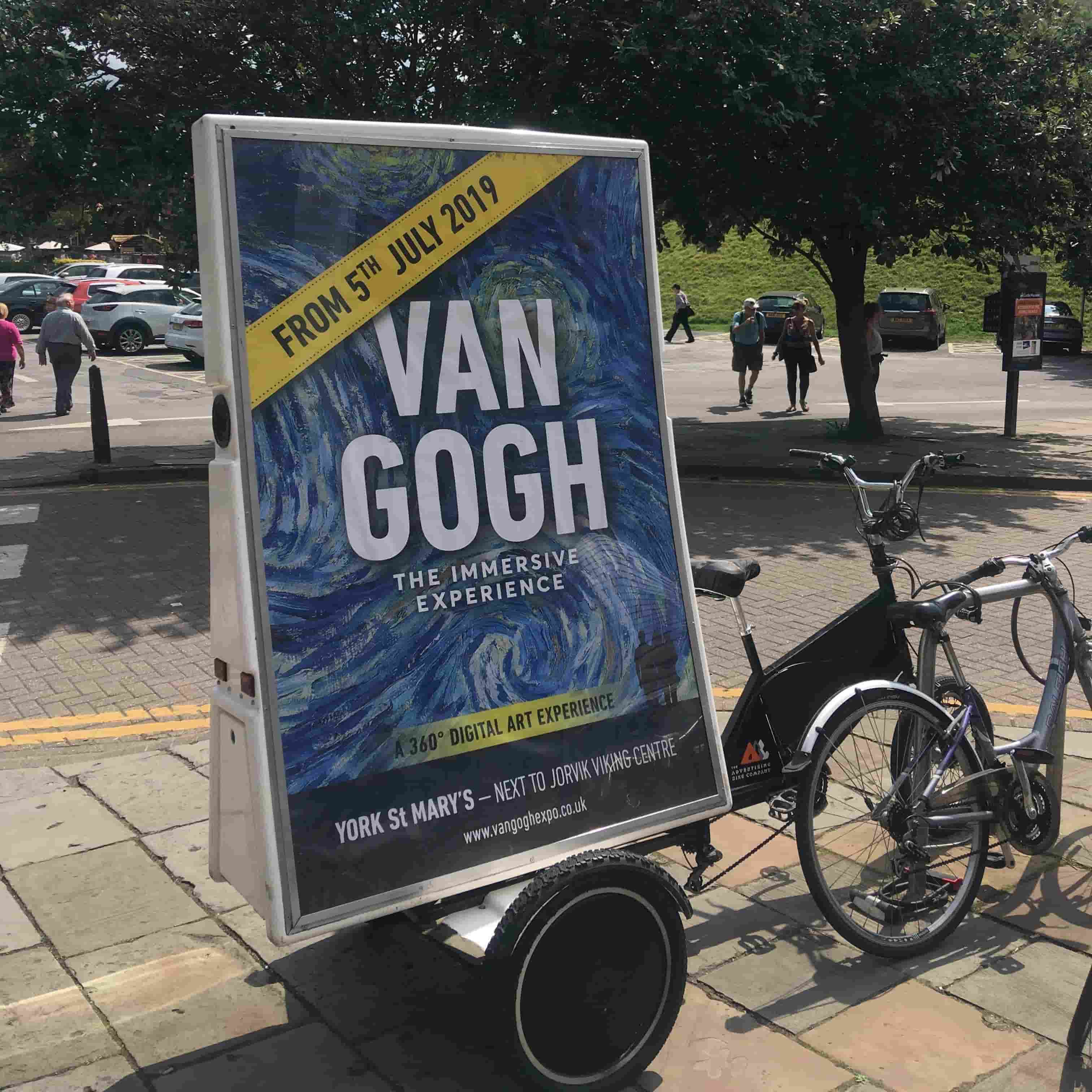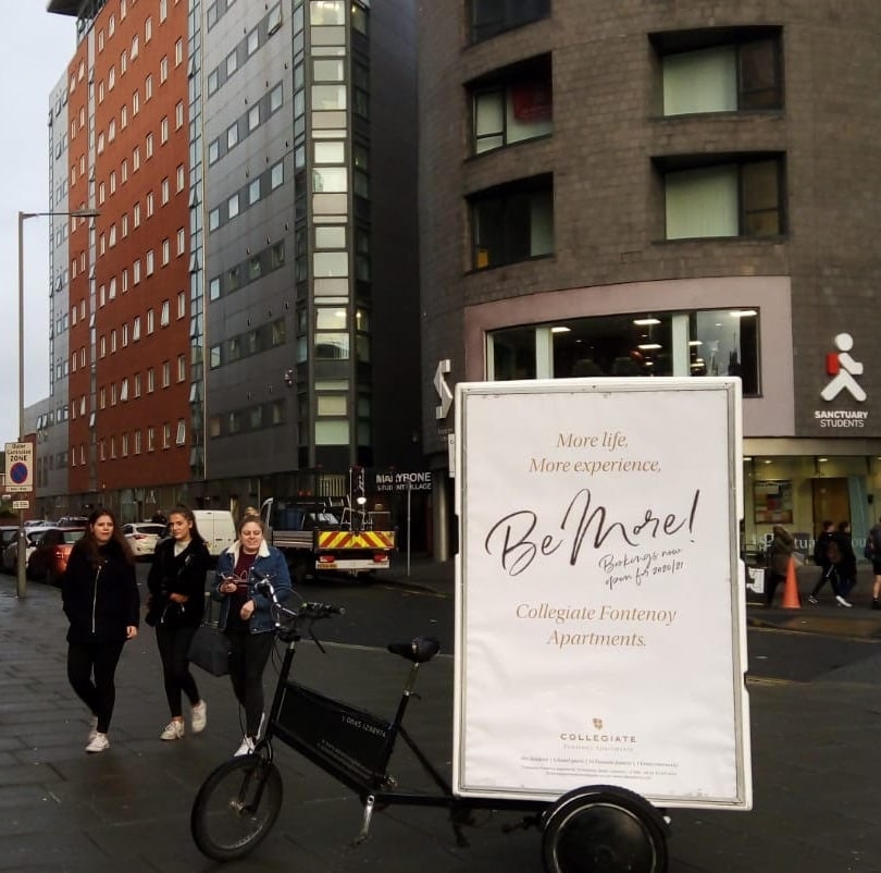 Each AdBike carry a surprisingly large integrated "AdPod"; this is big enough to host two sizeable 6-sheet posters (H1800mm x W1200mm) and is equipped with ample onboard storage allowing our savvy promotional riders to double-up as a built-in street team.
